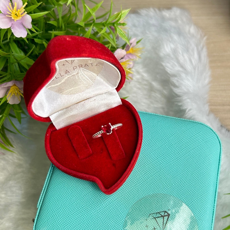 Anel Solitário Coração Vermelho Aro Bolinhas